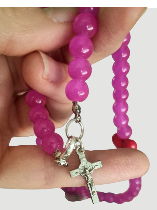 Collar con cuentas vidrio y corazón de metal, con cruz de metal en ganchito.