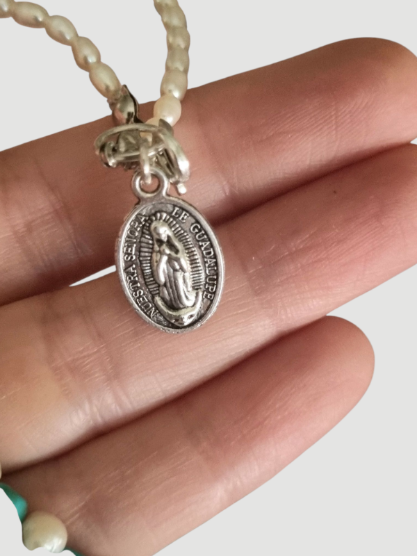 Collar de perlas de rio y piedras turquesas, con una medallita de Guadalupe en el gancho de cierre