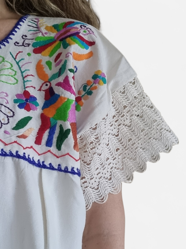 Camisa de algodón bordada a mano estilo tenango con las mangas bordadas en corchetes en talles XL. Un modelo inusual que solo viene en este talle.