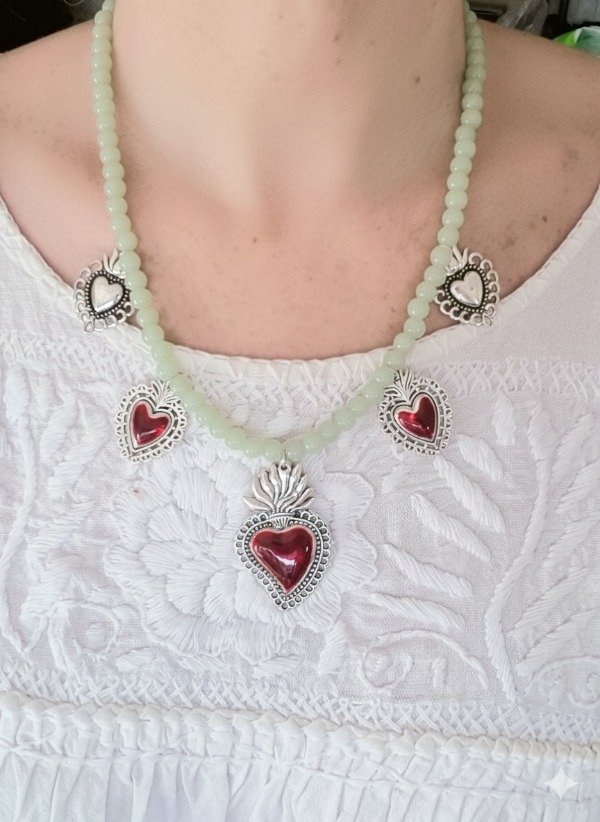Collar de perlas de vidrio de con dijes de corazón surtidos de metal estilo vintage mexicano