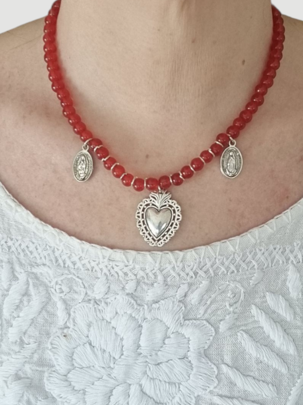 Collar de perlas de vidrio con corazones de metal