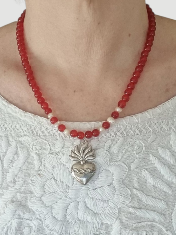 Collar de perlas de vidrio y de perlas de rio, con corazo de metal
