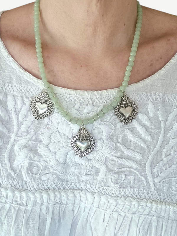 Collar de perlas de vidrio de con dijes de corazón iguales de metal estilo vintage mexicano