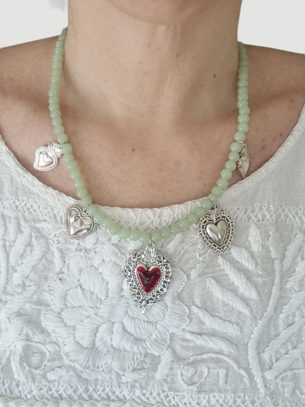 Collar de perlas de vidrio de con dijes de corazón surtidos de metal estilo vintage mexicano
