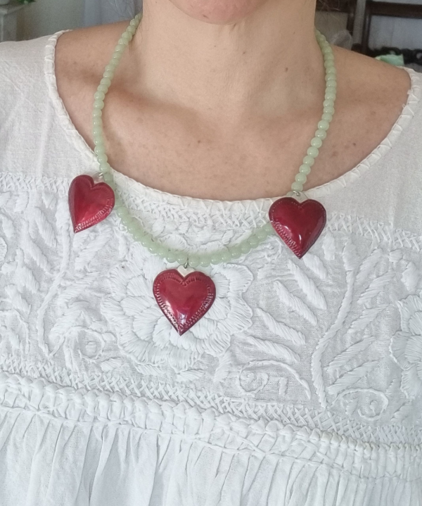 Collar de perlas de vidrio de distintos tamaños con dije de corazón de hijalata estilo vintage oaxaqueño